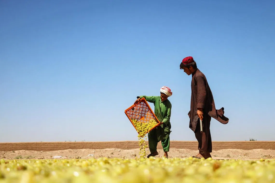 Afghan workers scatter fresh grapes for drying, at a field on the outskirts of Guzara district, Herat province on Sept 5, 2024.