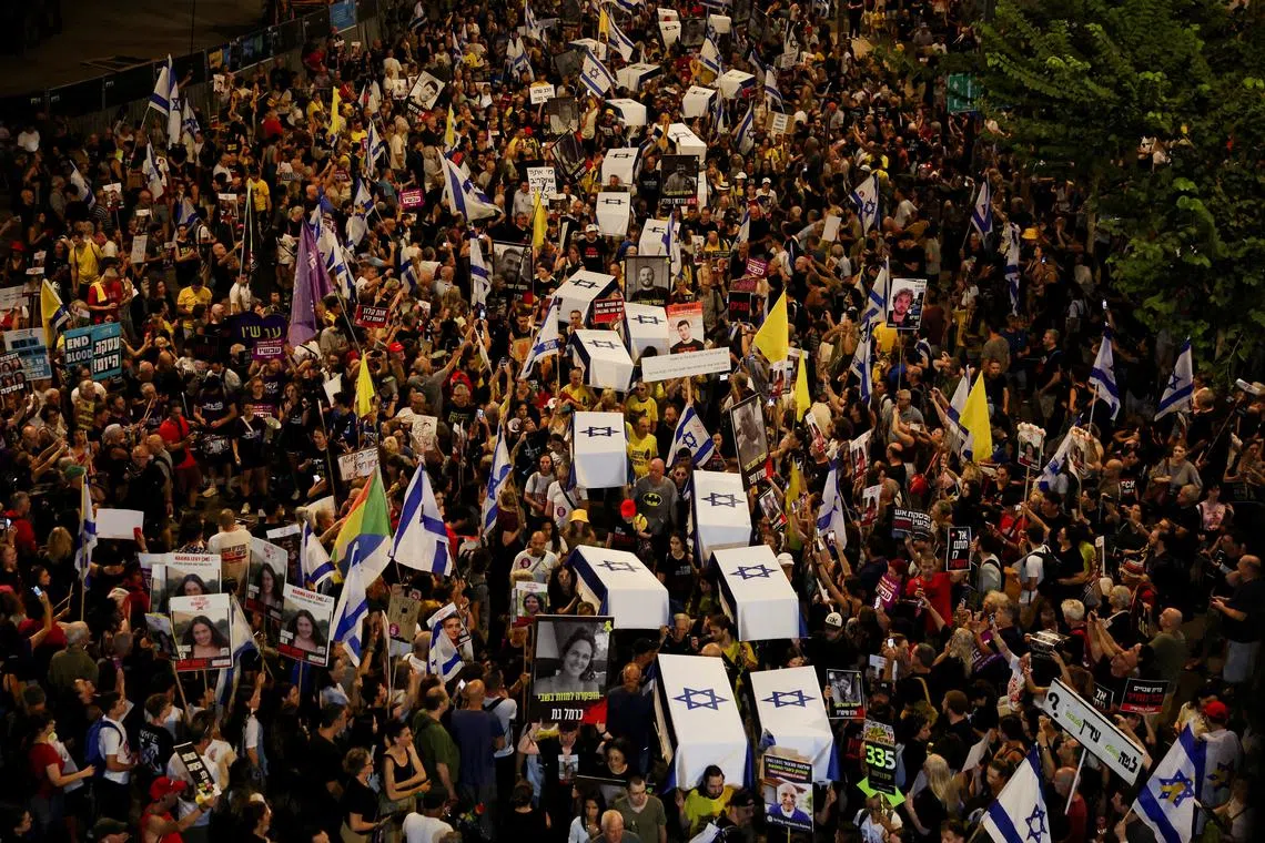Demonstrators carry mock coffins covered in Israeli flags during a protest to show support for the hostages who were kidnapped during the deadly Oct 7 attack, amid the ongoing conflict in Gaza between Israel and Hamas, in Tel Aviv, Israel, on Sept 5, 2024.