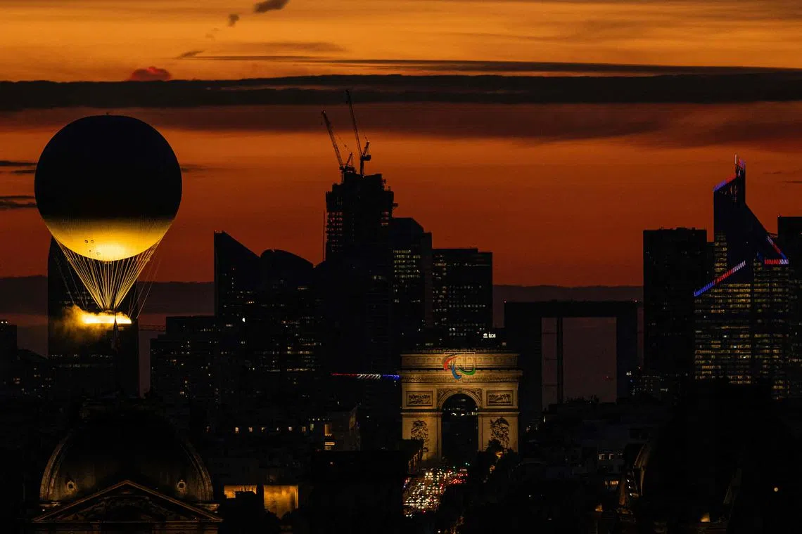 This photograph shows the Paris 2024 Olympic and Paralympic Games cauldron attached to a balloon carrying the Olympic flame lifts off, with the Arc de Triomphe and La Defense in the background, in Paris, France, on Sept 4, 2024.