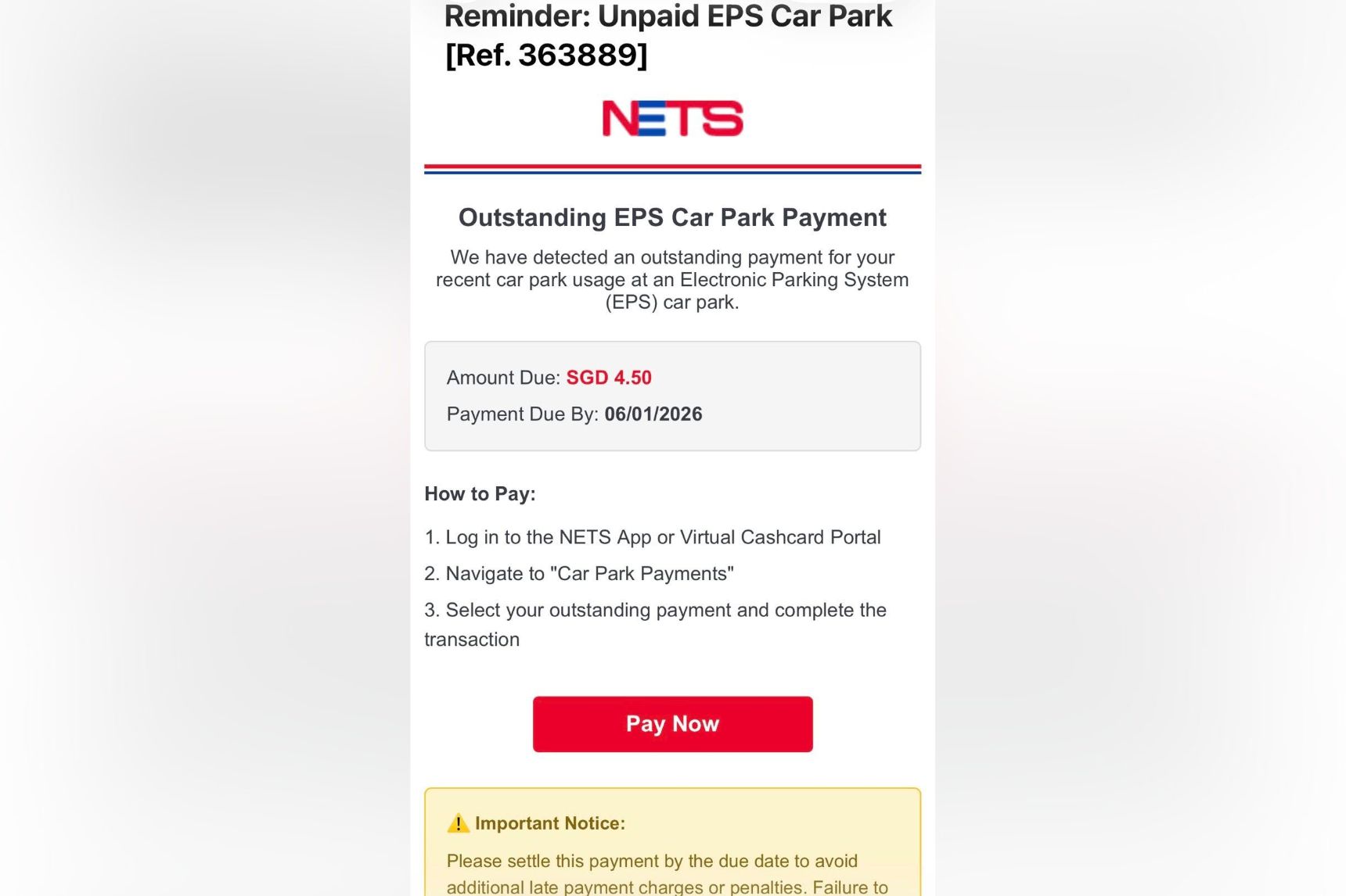 NETS warns public against scam e-mails asking for outstanding parking payment