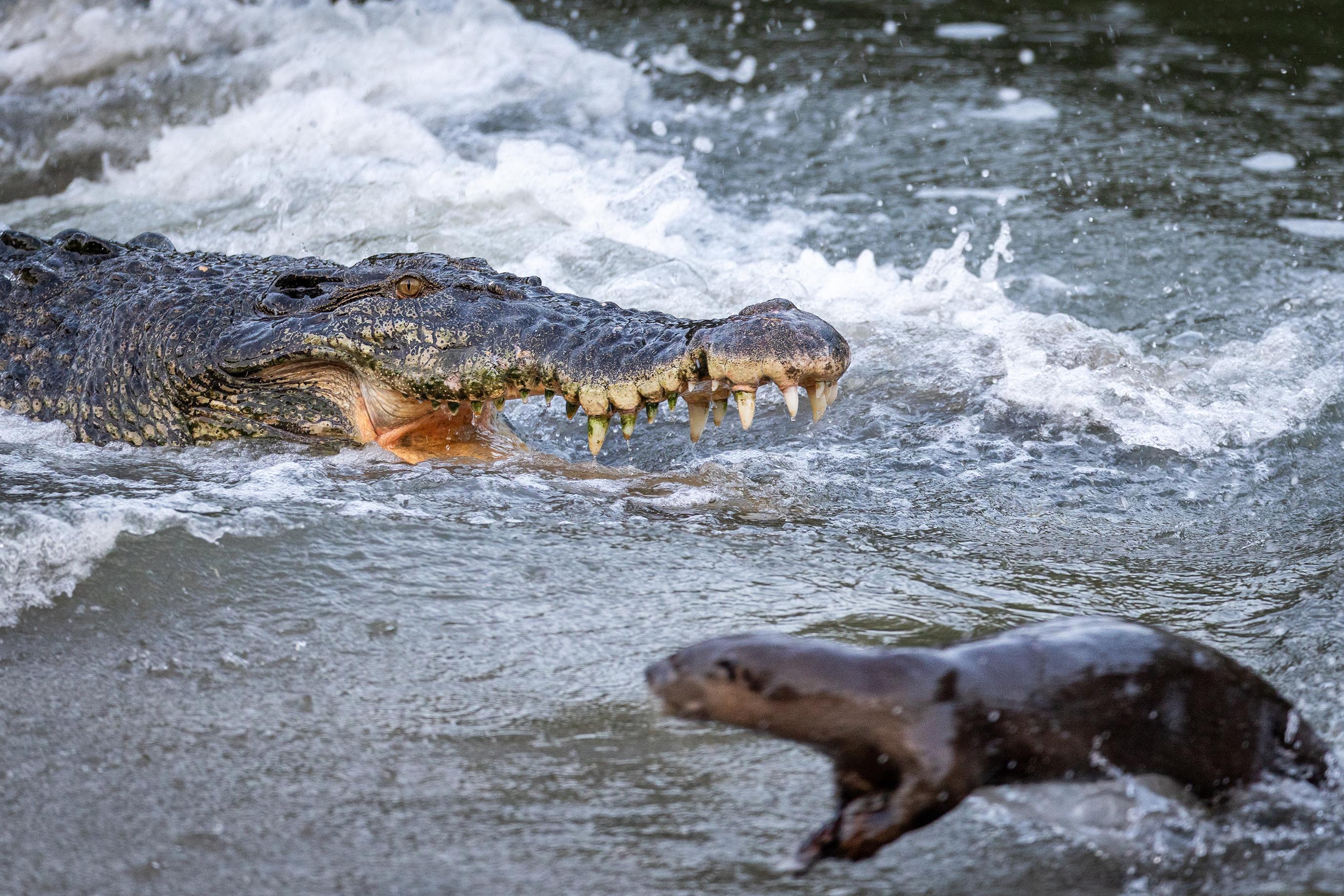 The crocodile is seen snapping at the otters several times before eventually retreating.