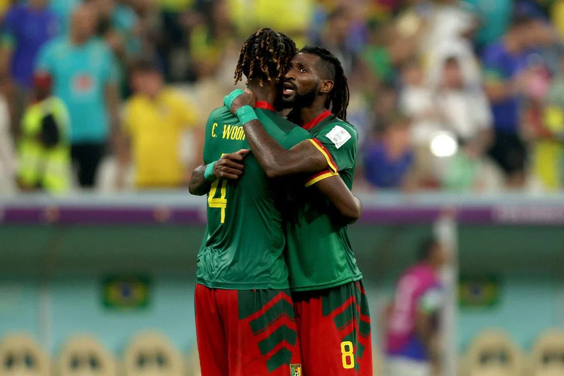 Cameroon’s Christopher Wooh (left) and Andre-Frank Zambo Anguissa celebrate at the end of the match against Brazil on Dec 2.