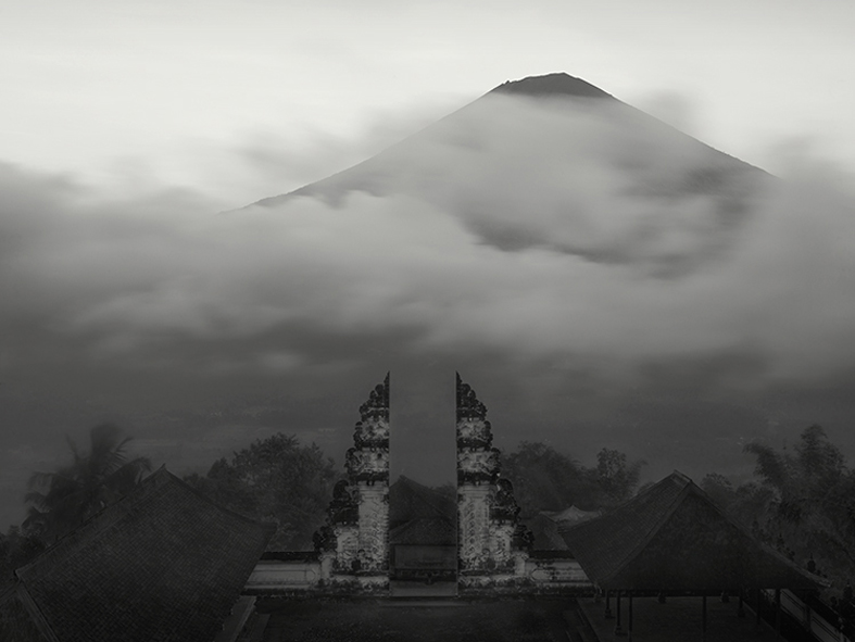 A black-and-white photograph featuring a view of Mount Agung in Bali.