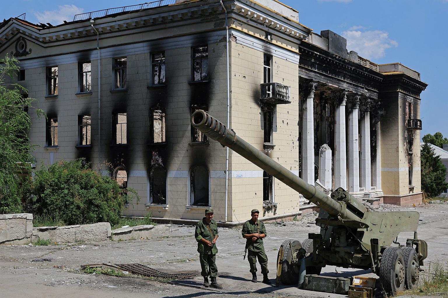 Service members of pro-Russian troops stand next to a howitzer during an exhibition of Ukrainian army hardware and weapons in Luhansk Region, Ukraine, on July 8, 2022.