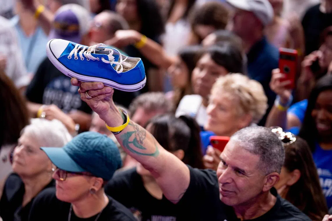 A man holding up a Converse Chuck Taylor shoe as US Vice-President Kamala Harris greets members of the audience at a campaign rally on Aug 9, 2024.