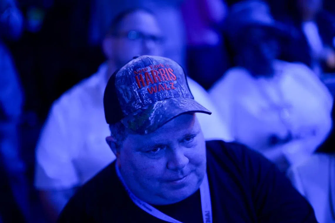 A delegate wearing a “Harris Walz” hat during the Democratic National Convention on Aug 22.