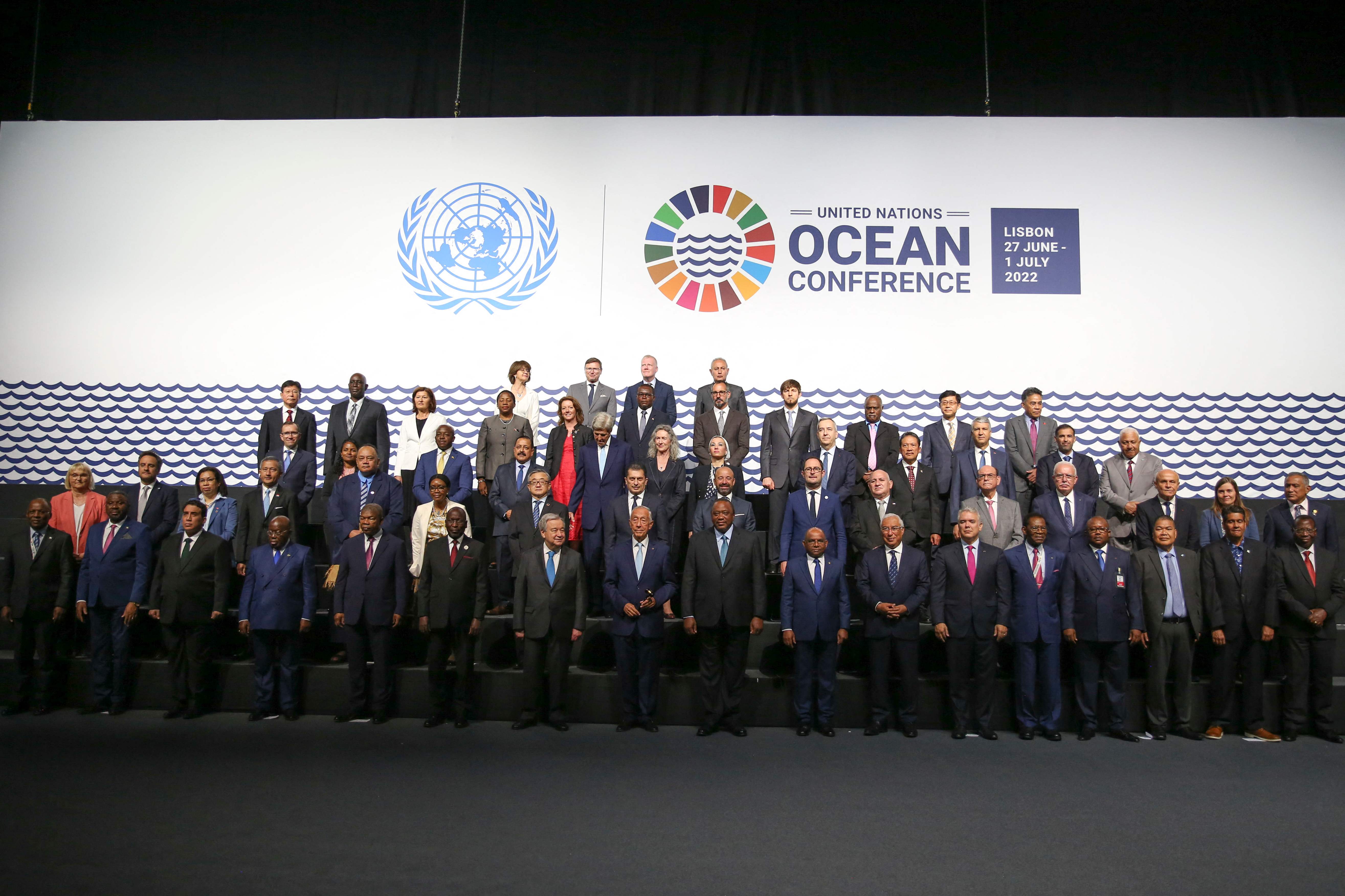 Members of the UN Ocean Conference pose for a group photo at Altice Arena in Lisbon on June 27, 2022.