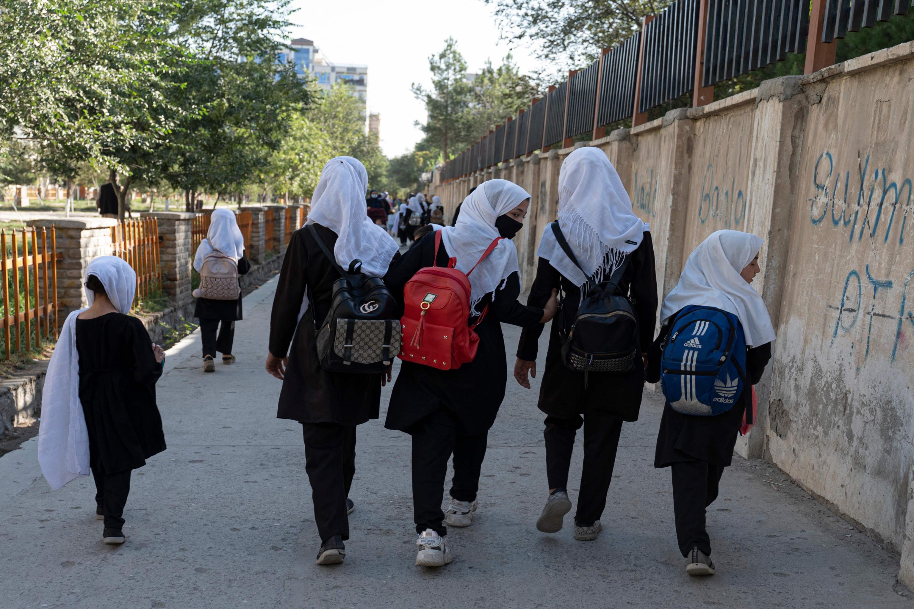 Afghan girls walking to school in Kabul. Aug 15 will mark one year since the Taliban swept back to power.