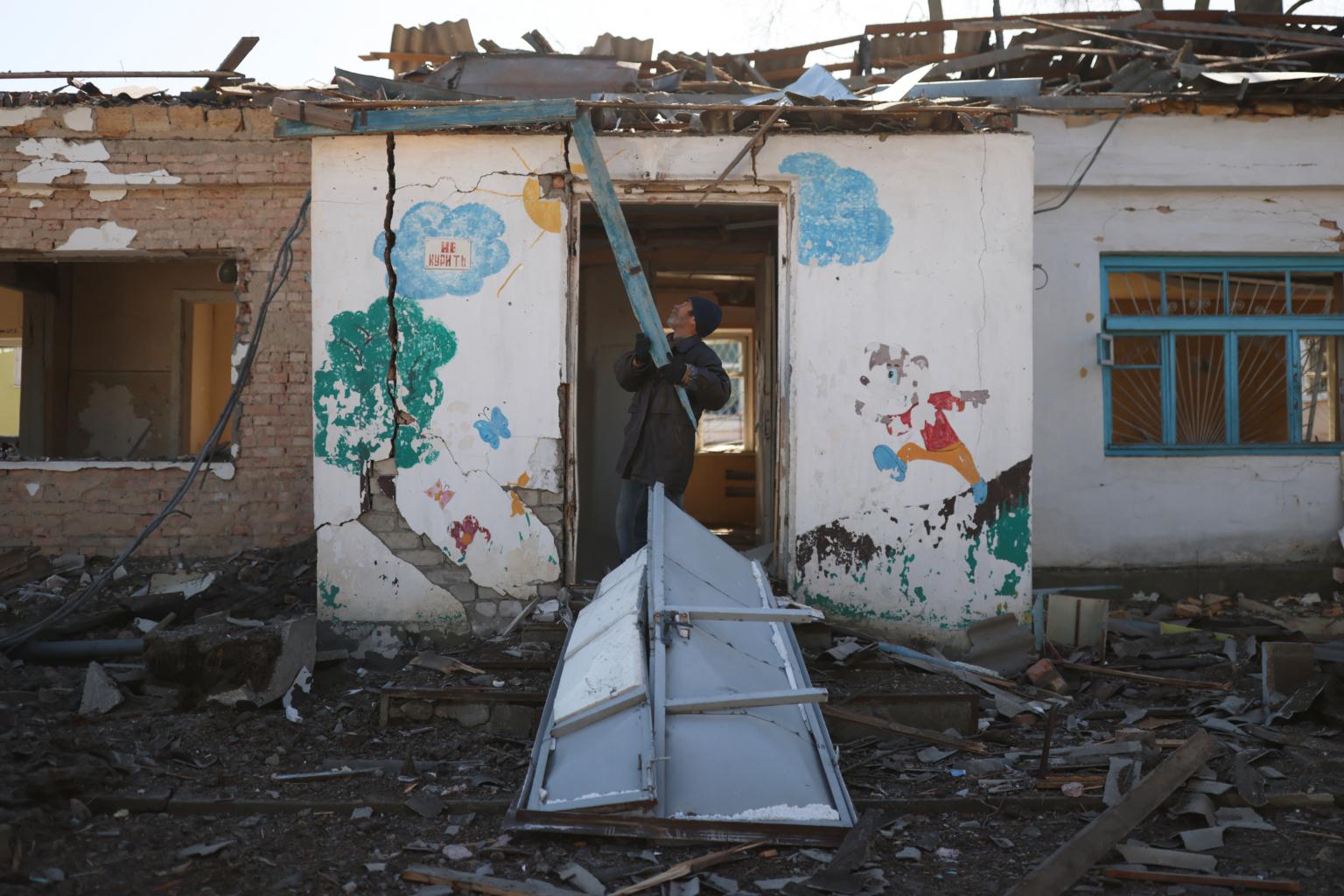 A man clearing rubble at the site of a damaged psychiatric hospital in Mykolaiv, Ukraine, on March 22, 2022.