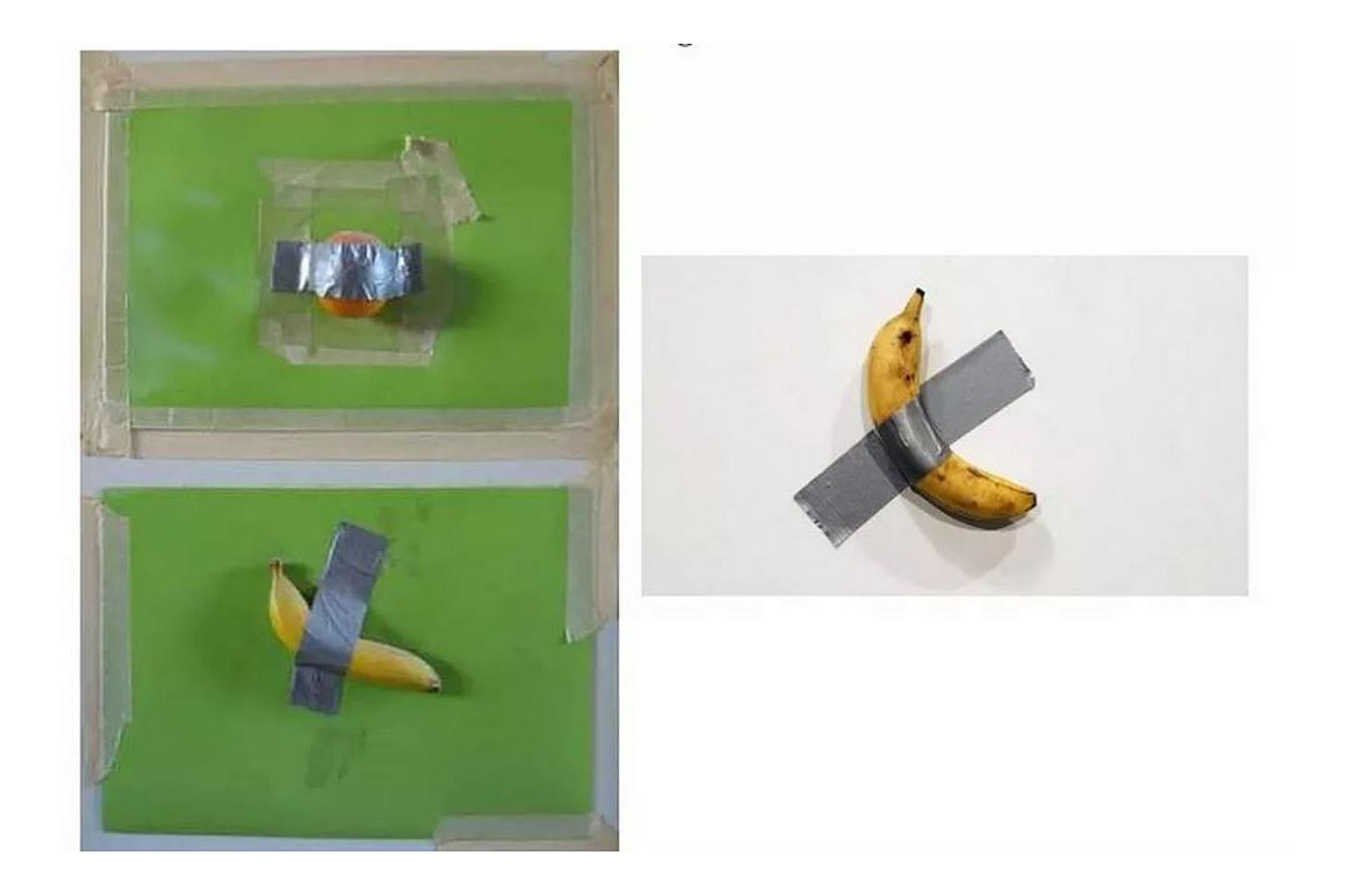 Banana & Oranges by Joe Morford (left) and Comedian by Maurizio Cattelan (right).