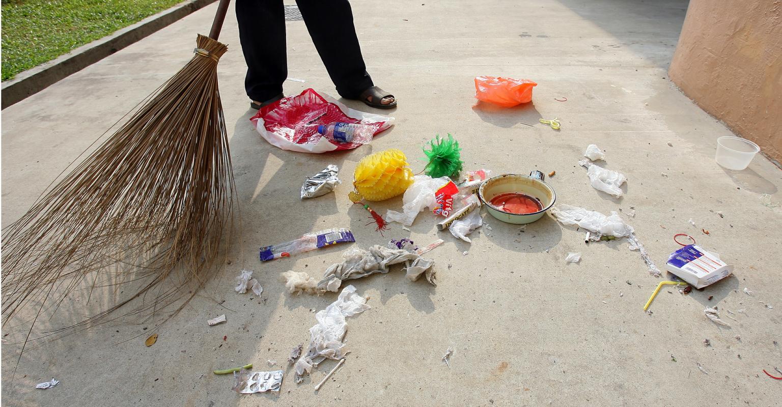 A cleaner sweeps up litter at Hougang Ave 1 Blk 126. Many Singaporeans have the perception that keeping the environment clean is the job of the cleaners only. PHOTO: ST FILE