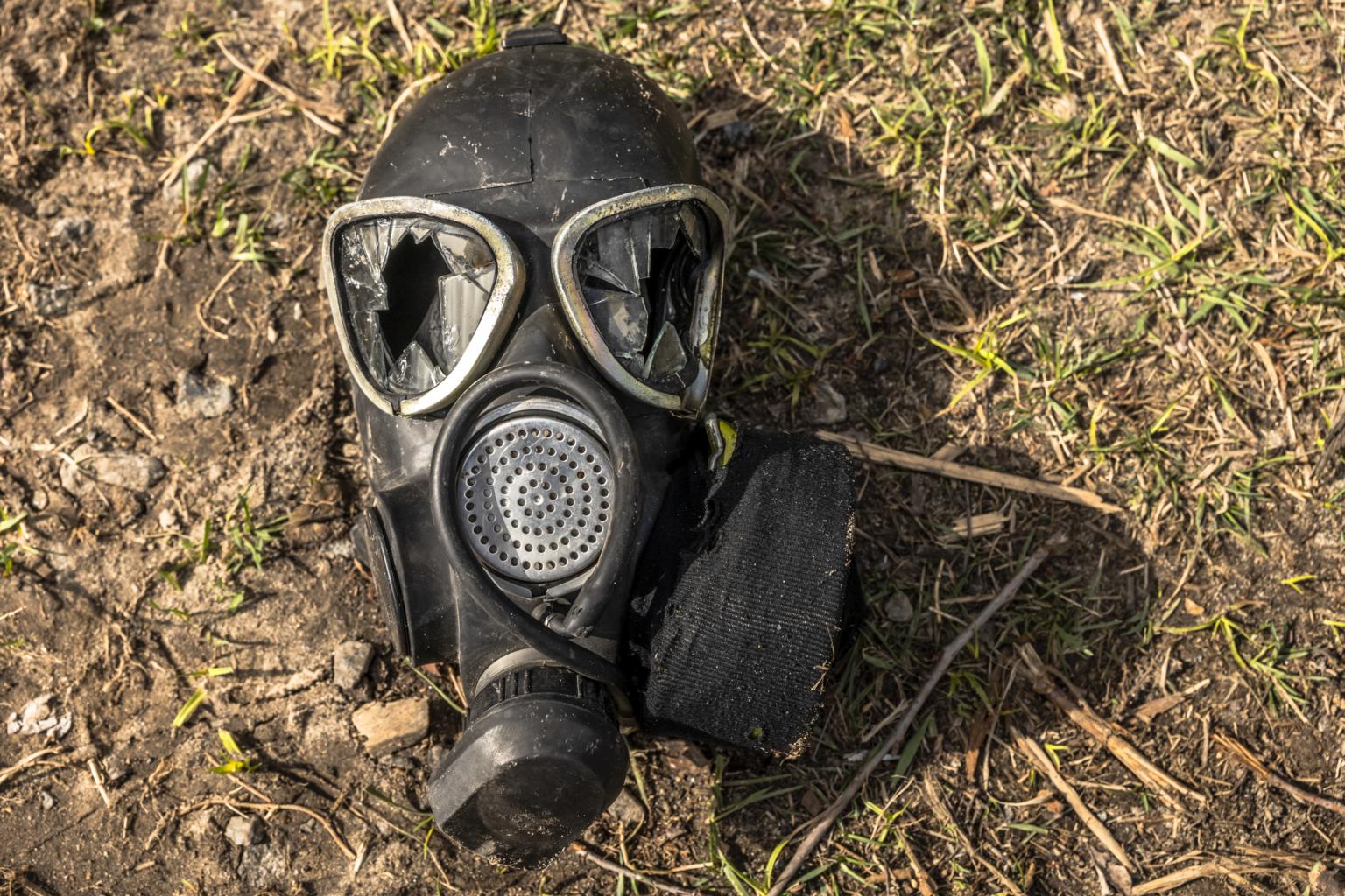 A broken Russian military gas mask discarded on the ground in Bucha.