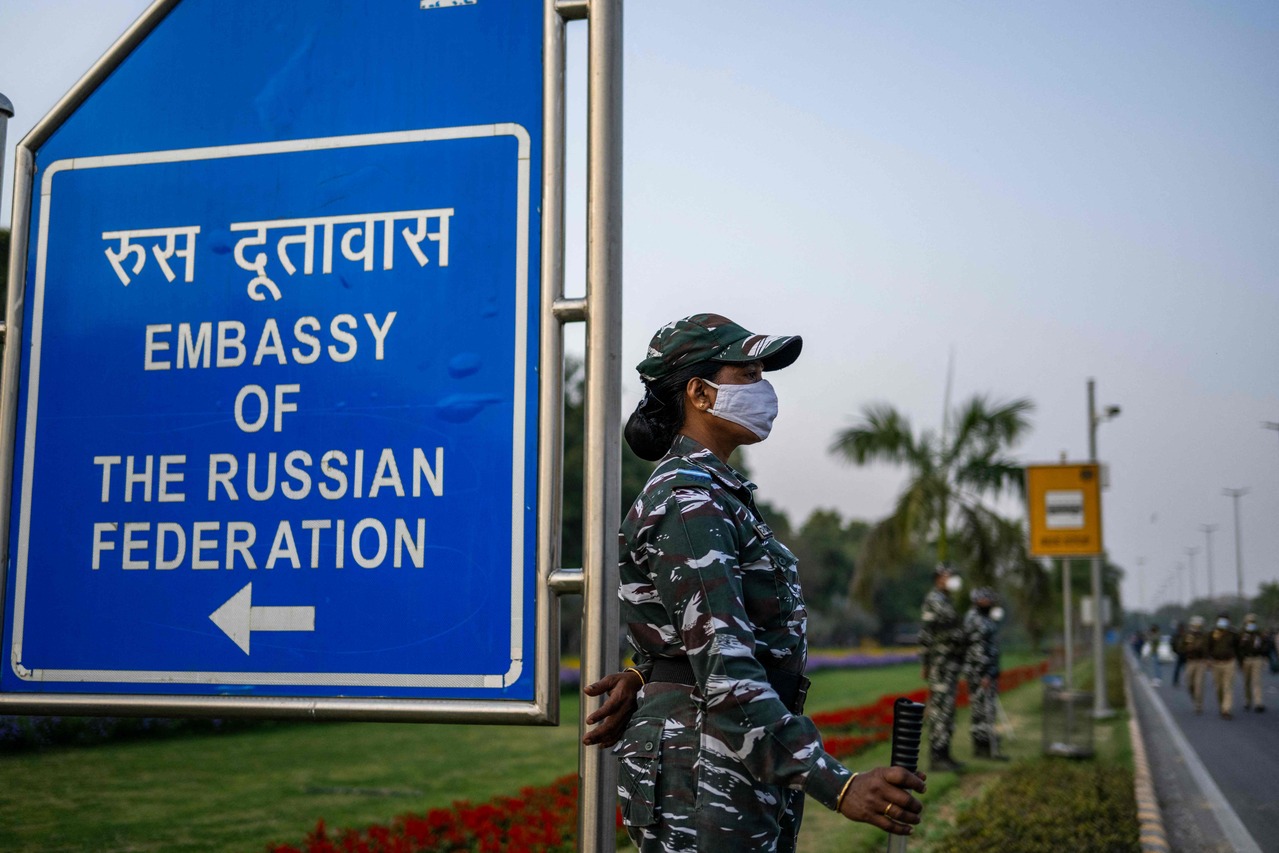 Police officers standing guard near the Russian Embassy in New Delhi on Feb 25, 2022.