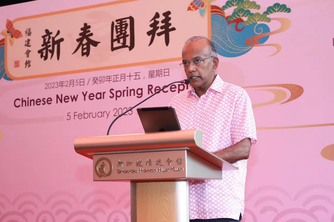 Law and Home Affairs Minister K. Shanmugam speaking at the Singapore Hokkien Huay Kuan clan association on Feb 5, 2023.
