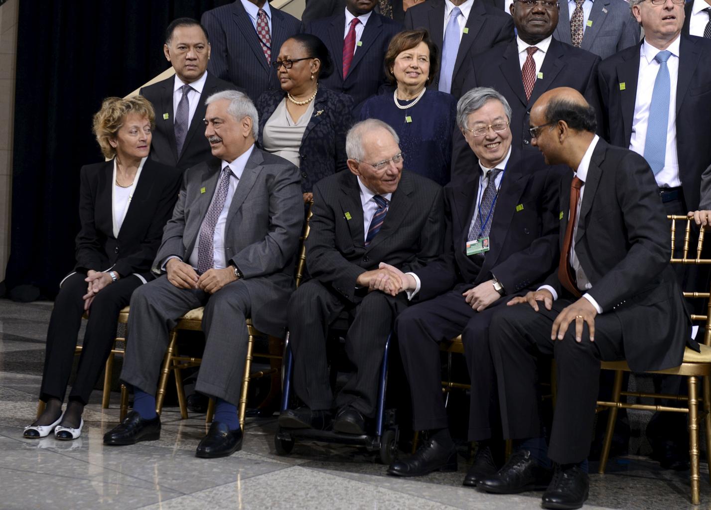 (Front row, from left) Switzerland's Finance Minister Eveline Widmer-Schlumpf, Saudi Arabia's Finance Minister Abdulaziz Al-Assaf, Germany's Finance Minister Wolfgang Schaeuble, People's Bank of China Governor Zhou Xiaochuan and Singapore's Finance Minister Tharman Shanmugaratnam gather for a group photo of the International Monetary and Financial Committee (IMFC) governors, during the IMF and World Bank's 2015 Annual Spring Meetings, in Washington, April 18, 2015. PHOTO: REUTERS
