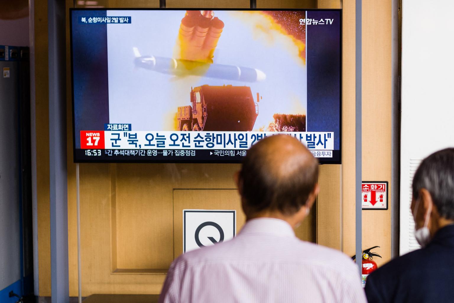 People watch a news broadcast with file footage of a North Korean missile test, at a railway station in Seoul, on Aug 17, 2022.