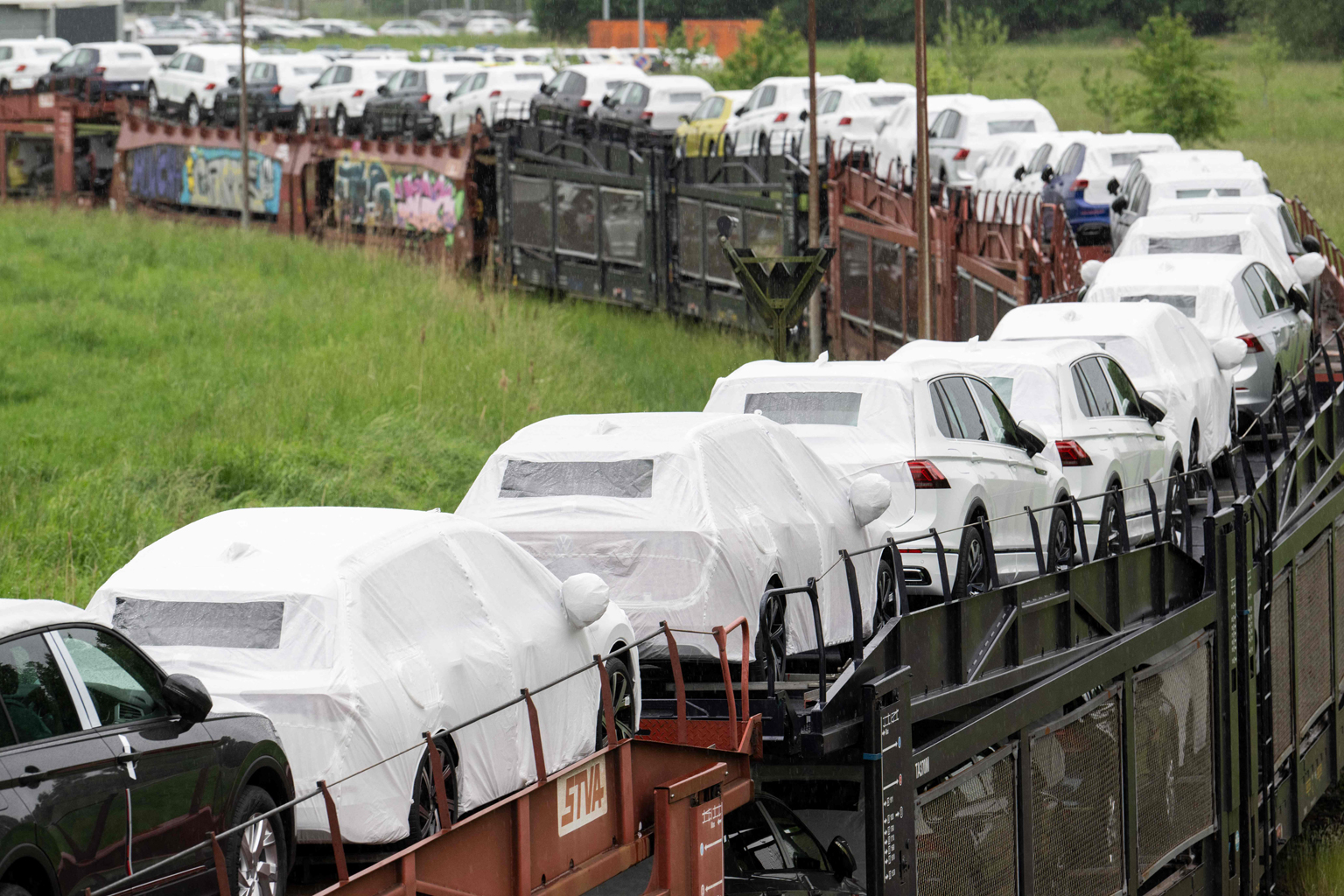 Cars being transported by rail at the production site of German carmaker Volkswagen in Emden in northern Germany last week.