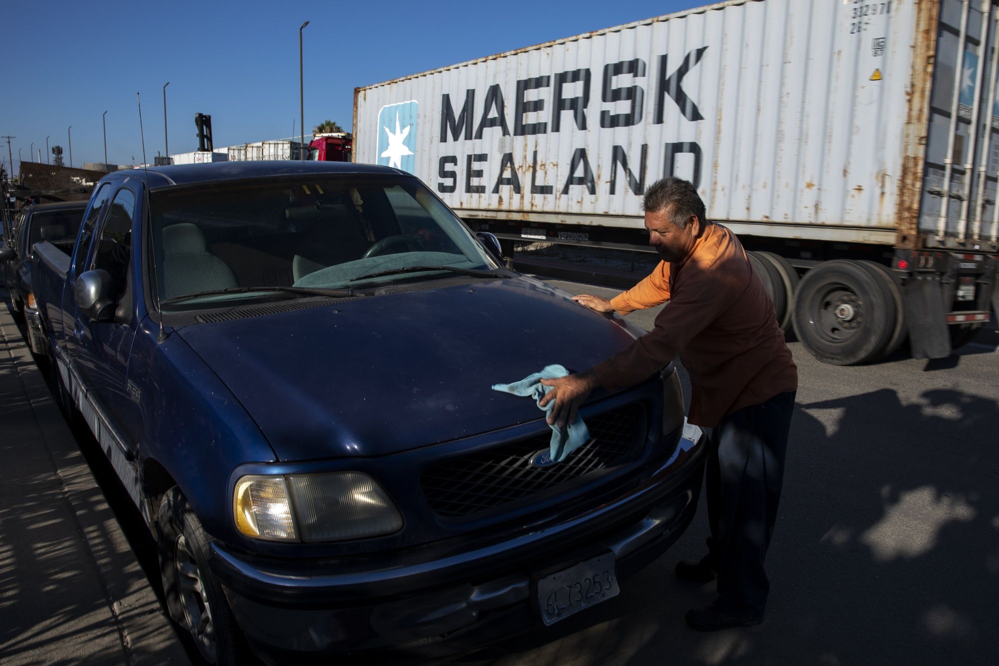 A resident cleans dust off of a vehicle from semi-trucks in the Wilmington area of Los Angeles, on July 12, 2022.