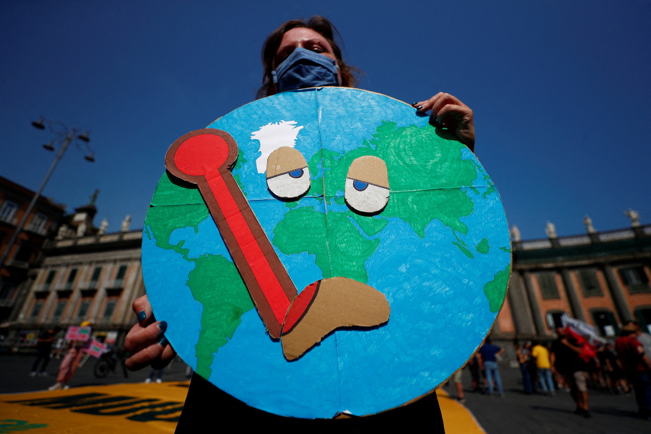An activist protests while G-20 climate and environment ministers hold a meeting in Naples, Italy, on July 22, 2021.