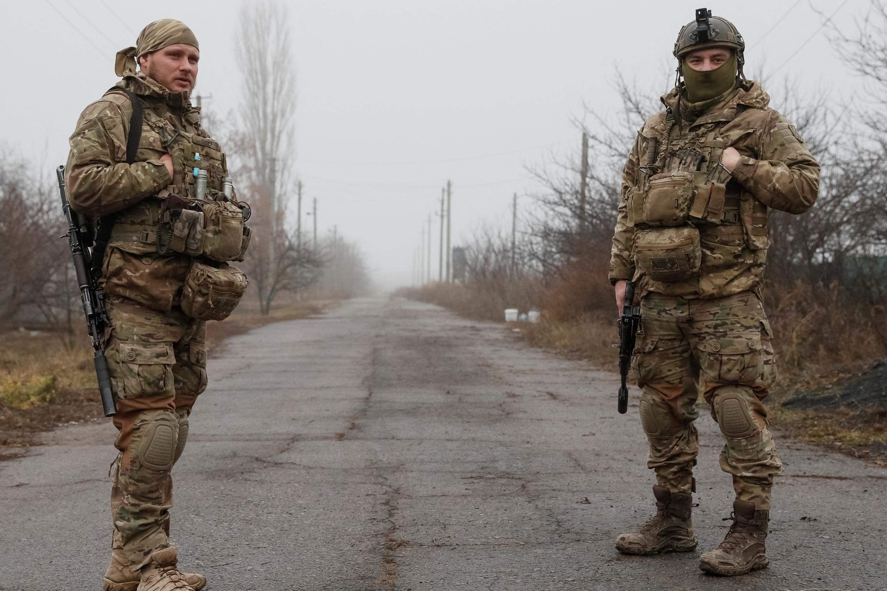 Ukrainian servicemen are seen on the front line near the village of Travneve in Donetsk region, Ukraine on Dec 15, 2021.
