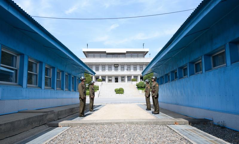 North Korean soldiers stand guard at the Joint Security Area on the Demilitarized Zone in the border village of Panmunjom on April 26, 2018.