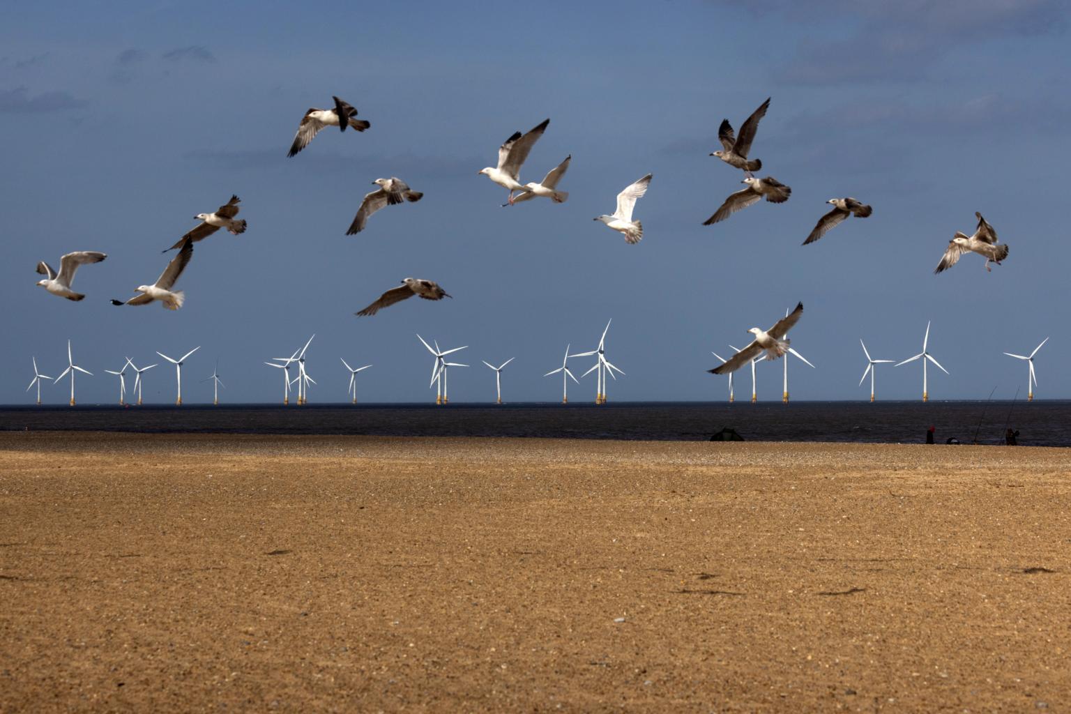Seagulls with offshore wind turbines in the background at the Scroby Sands Wind Farm near Great Yarmouth, in the UK.