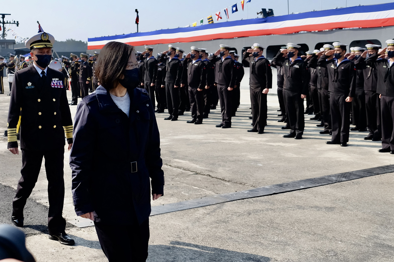 Taiwan President Tsai Ing-wen inspecting navy troops during the inauguration ceremony of domestically produced mine-laying ships at a navy base in Kaohsiung, southern Taiwan, on Jan 14, 2022.