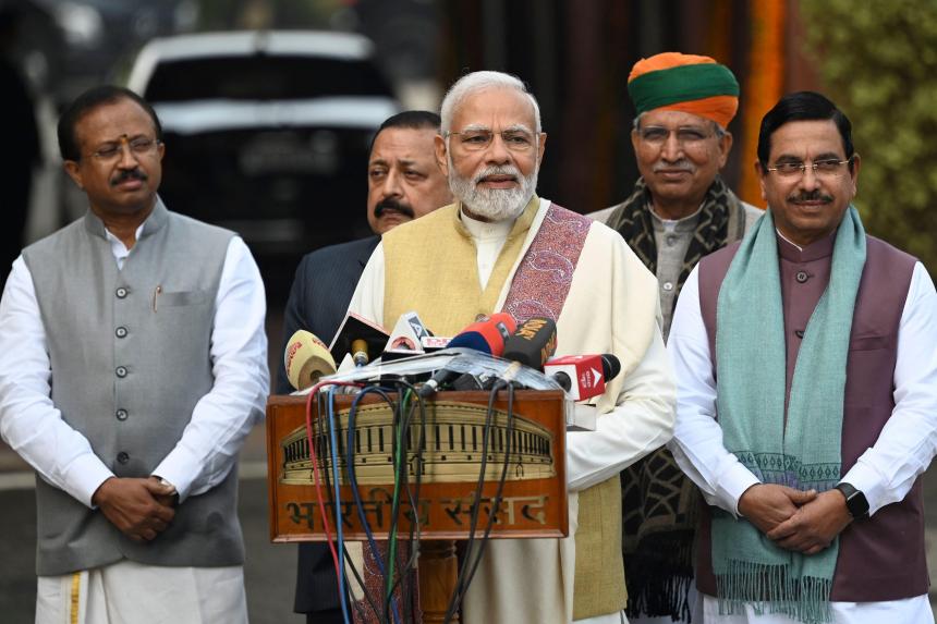 Mr Narendra Modi (centre) speaking to media at the opening of the budget session of Parliament in New Delhi on Jan 31, 2023.