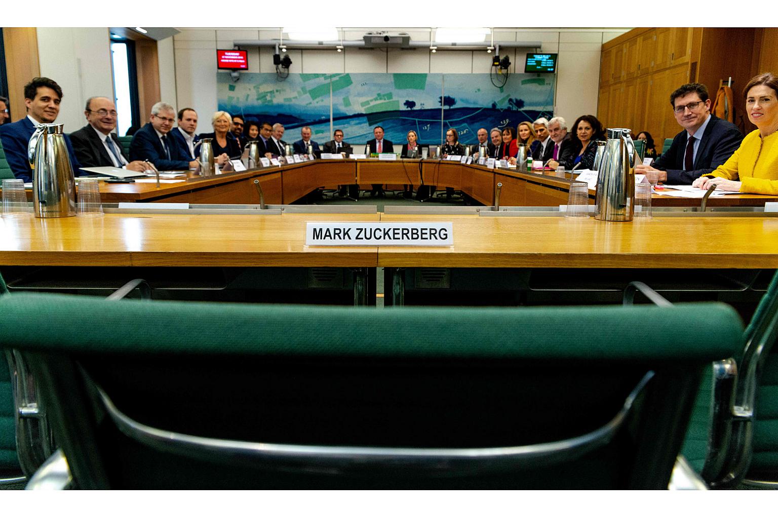Representatives from nine countries at the hearing in London yesterday. Facebook chief executive Mark Zuckerberg was invited to testify but did not attend. The company's vice-president of policy solutions Richard Allan was sent instead.
