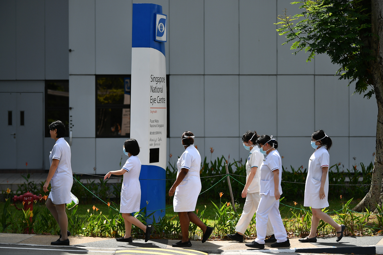 Nurses wearing face masks walk outside the Singapore National Eye Centre on March 7, 2020.