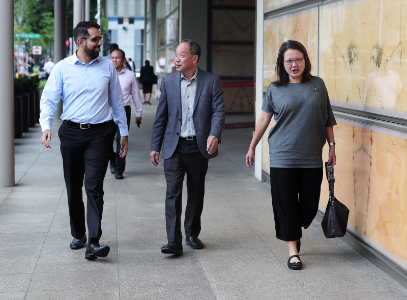 Workers' Party's Pritam Singh, Low Thia Khiang and Sylvia Lim at the Supreme Court on Oct 8, 2018. The court was told the town council and its MPs regularly went to the ground to ensure FMSS performed up to satisfaction.