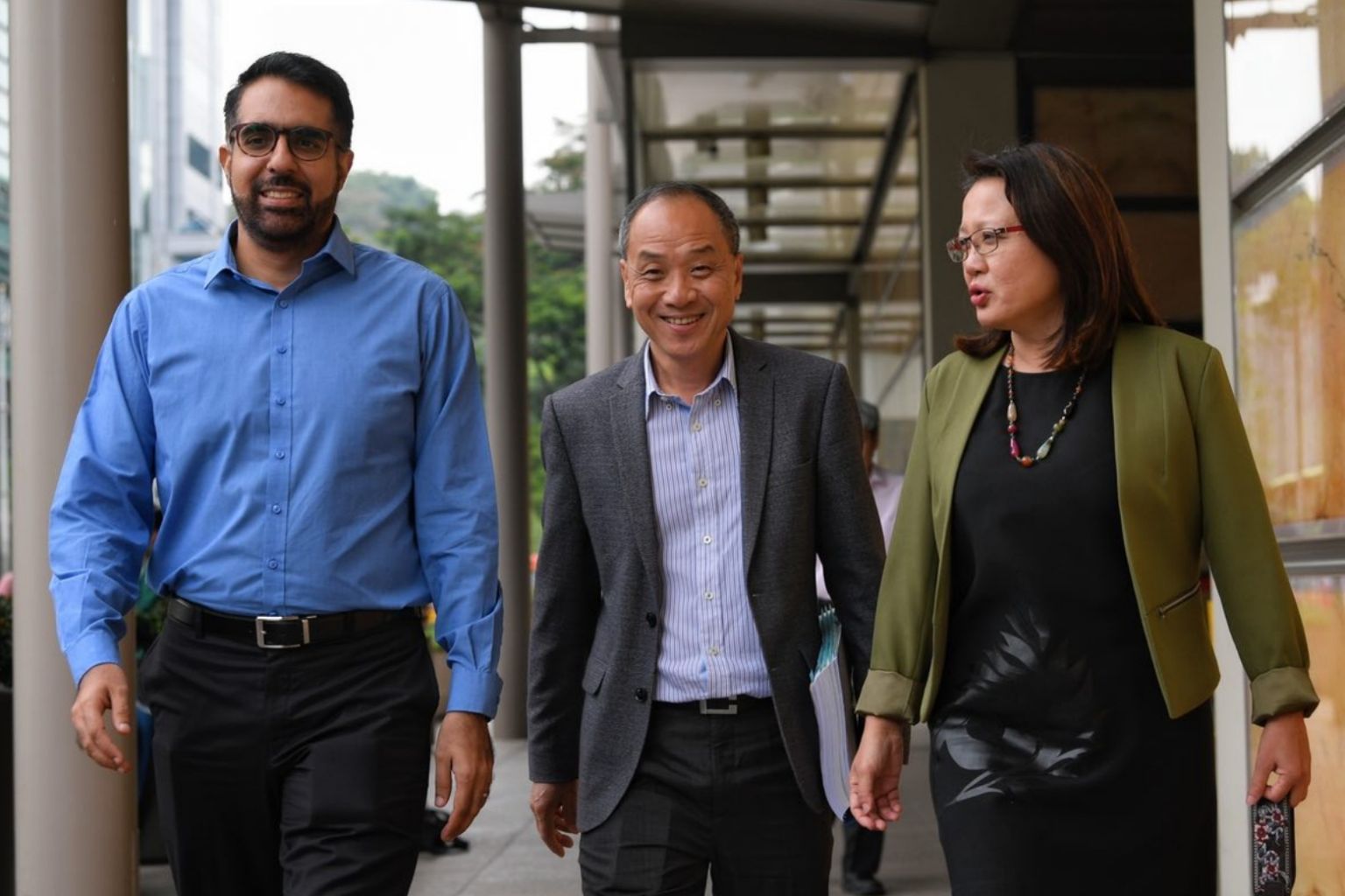 Workers' Party MPs Pritam Singh, Low Thia Khiang and Sylvia Lim outside the Supreme Court on Oct 9, the third day of a multimillion-dollar trial.