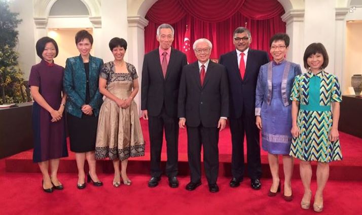 (From left) Ms Sim Ann, Mrs Josephine Teo, Ms Indranee Rajah, PM Lee Hsien Loong, President Tony Tan Keng Yam, Chief Justice Sundaresh Menon, Minister for Culture, Community and Youth Grace Fu and Dr Amy Khor at the swearing-in ceremony on Oct 1, 2015.