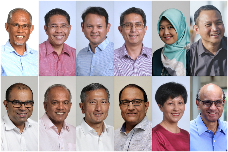 (Clockwise from top left) Mr Masagos Zulkifli, Dr Maliki Osman, Mr Zaqy Mohamad, Dr Faishal Ibrahim, Ms Rahayu Mahzam, Mr Mohd Fahmi Aliman, Mr Tharman Shanmugaratnam, Ms Indranee Rajah, Mr S. Iswaran, Dr Vivian Balakrishnan, Mr K. Shanmugam and Dr Janil Puthucheary.