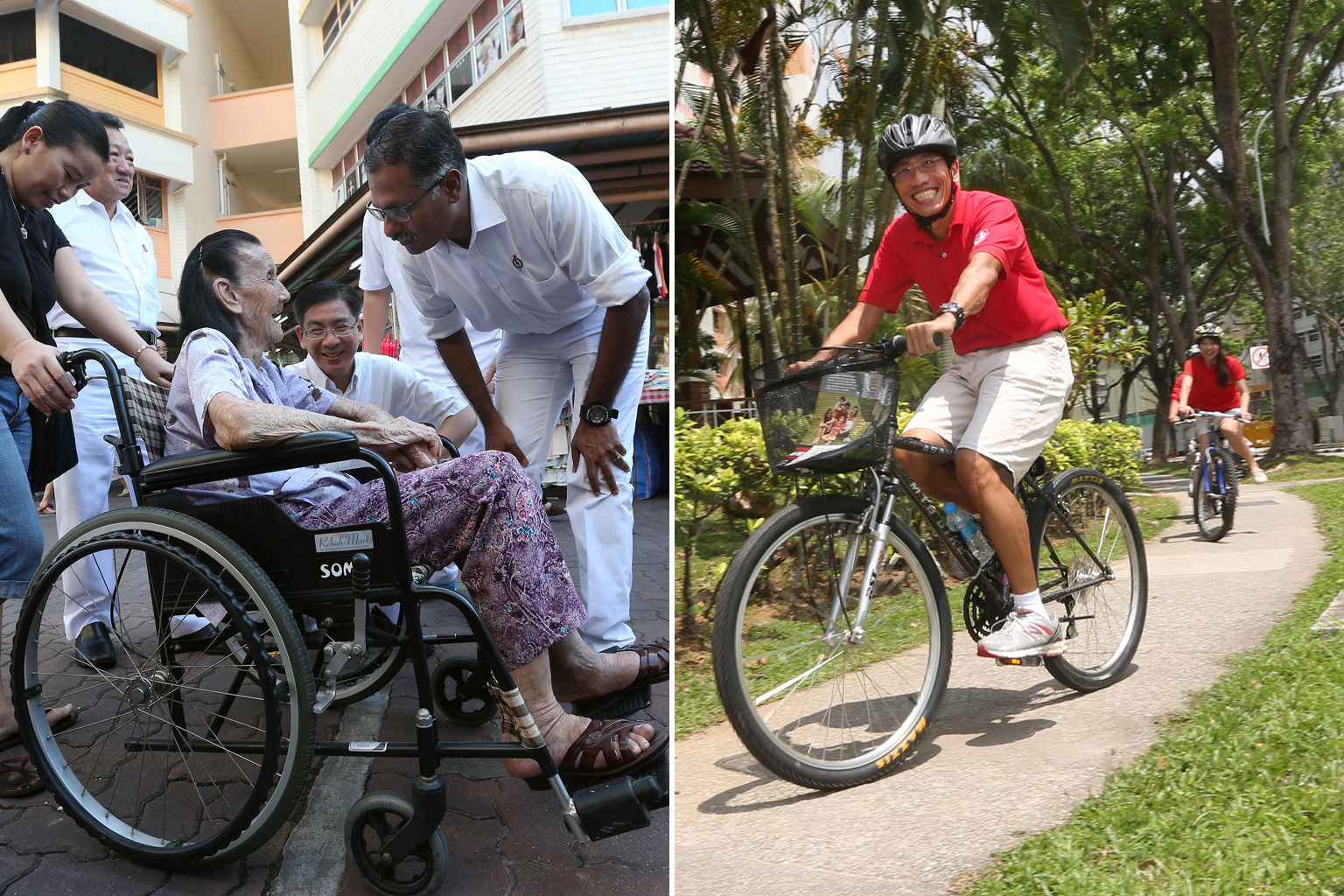 Both men vying to represent Bukit Batok residents in Parliament made the most of yesterday's public holiday to win hearts and votes ahead of Saturday's by-election. After People's Action Party (PAP) leaders called on voters to consider the character of candidates at the start of the weekend, drawing a riposte from Singapore Democratic Party (SDP) members at their Sunday rally, temperatures cooled down somewhat yesterday. On a walkabout, PAP candidate Murali Pillai (left) gave more details about his healthcare plans for elderly residents, with help from a cooperative that will bring regular medical check-ups to the estate. SDP chief Chee Soon Juan (right), meanwhile, cycled round the estate to meet residents, and pledged to focus on running the town if elected. Asked by reporters about the issue of character, he said it is important but voters can judge for themselves.