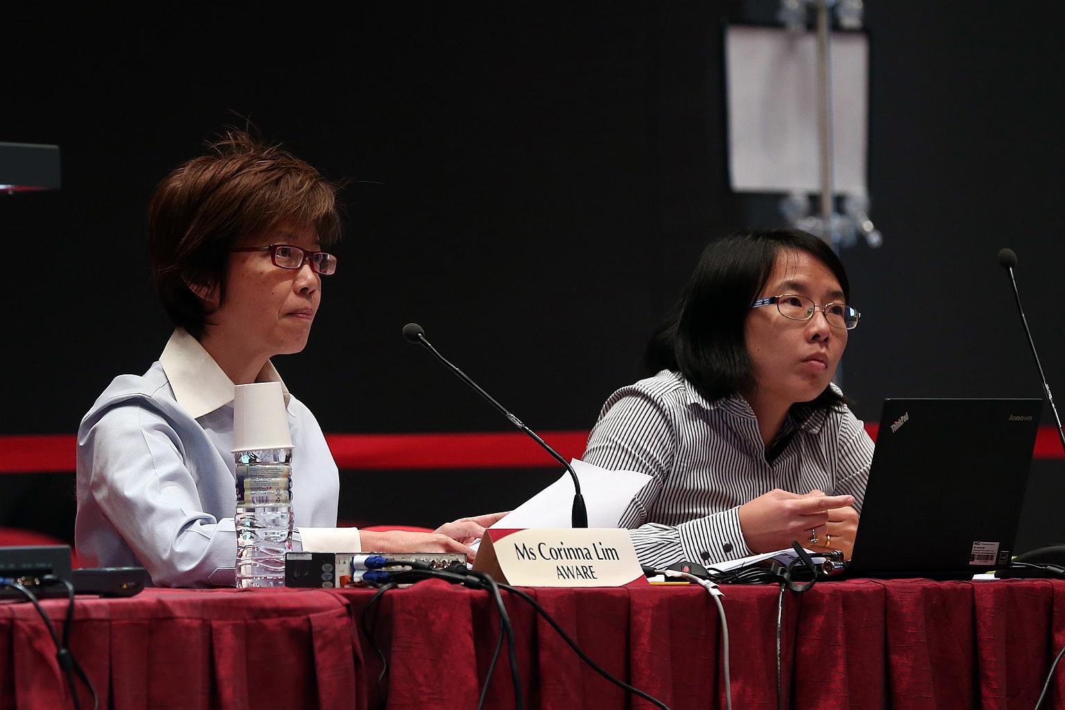 Representatives from Association of Women for Action and Research (Aware) Ms Corinna Lim (left) and Ms Jolene Tan at the Constitutional Commission 2016 public hearing, on April 18, 2016.