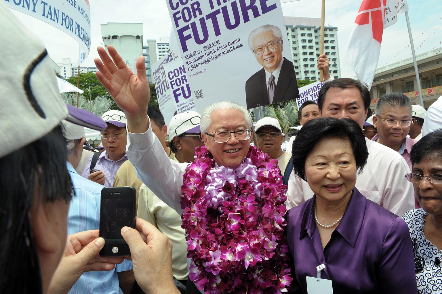 Dr Tony Tan Keng Yam (centre) and his wife Mary waving to supporters at the People's Association headquarters on Nomination Day, Aug 17, 2011, during the Presidential Election.