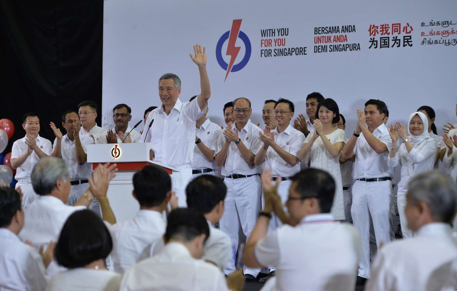 PAP members applauding after Prime Minister Lee Hsien Loong (with hand risen) introduces new election candidates on Aug 29, 2015.