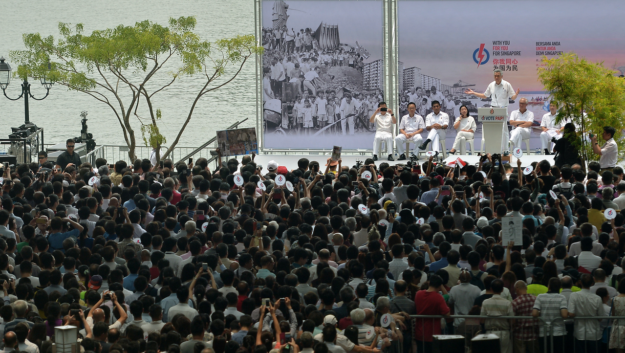 Prime Minister Lee Hsien Loong speaking at a People's Action Party lunchtime rally at the Promenade area beside UOB Plaza on Sept 8, 2015.