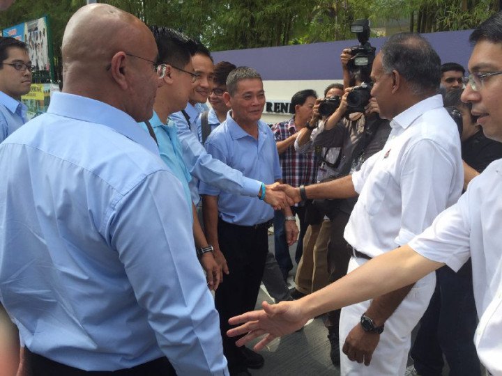 Mr K. Shanmugam, anchor minister for Nee Soon GRC, shared a friendly handshake with WP candidate Kenneth Foo outside their nomination centre, while a PAP supporter was photographed sheltering a wheelchair-bound Chiam See Tong with an umbrella when the latter arrived at Kong Hwa School to support his wife Lina Chiam's nomination for Potong Pasir SMC.