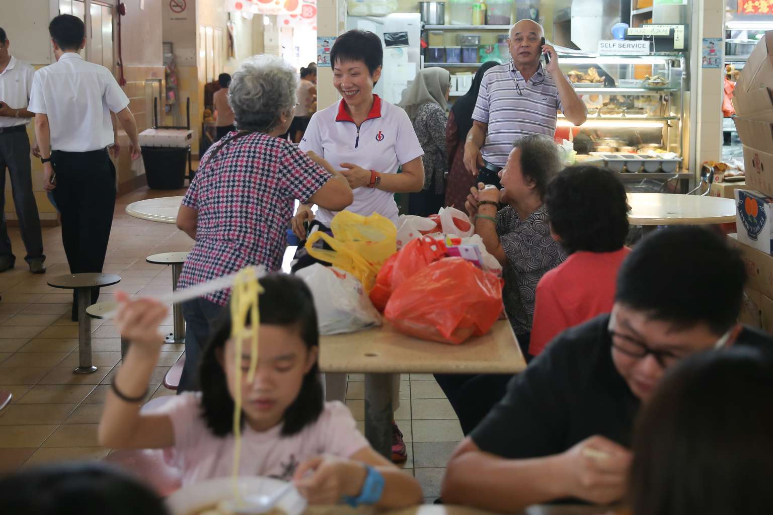 Minister for Culture, Community and Youth Grace Fu at Yuhua Village Market and Hawker Centre during general election campaigning period.