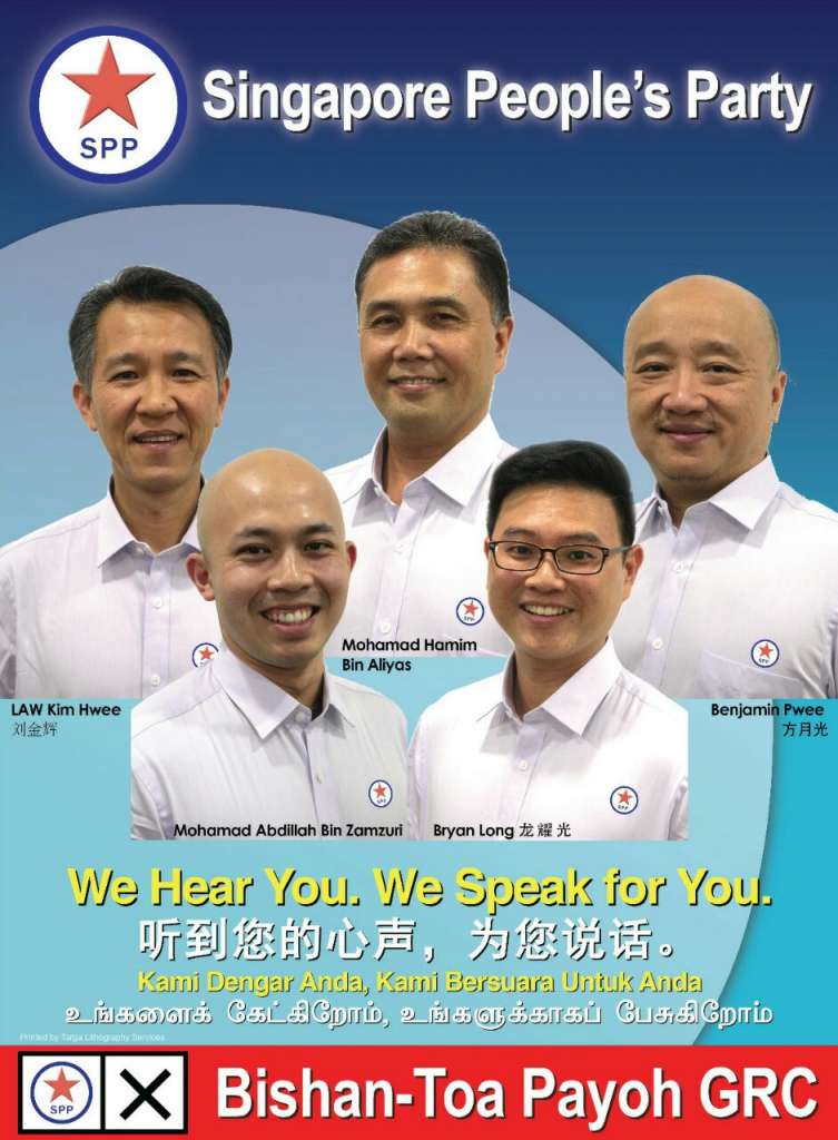 The poster features two Democratic Progressive Party(DPP) members - party chief Benjamin Pwee, 47, and chairman Hamim Aliyas, 50 - and three Singapore People's Party members: former sales and marketing manager Law Kim Hwee, 55, training company owner Abdillah Zamzuri, 31, and entrepreneur Bryan Long, 37.