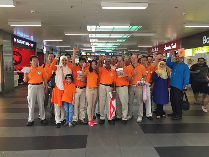 Members of the National Solidarity Party posing at Woodlands MRT station during a walkabout in the Woodlands and Sembawang areas on Sunday morning.