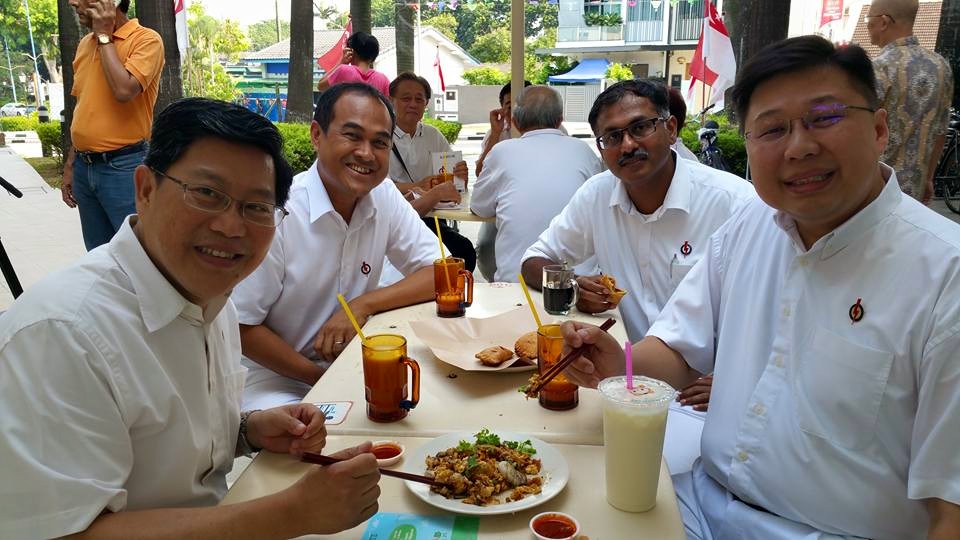 In a Facebook post on the PAP Aljunied GRC page, team leader Yeo Guat Kwang and his team mates Shamsul Kamar, K. Muralidharan Pillai and Chua Eng Leong were pictured at Serangoon Gardens tucking into ork luak and some curry puffs.