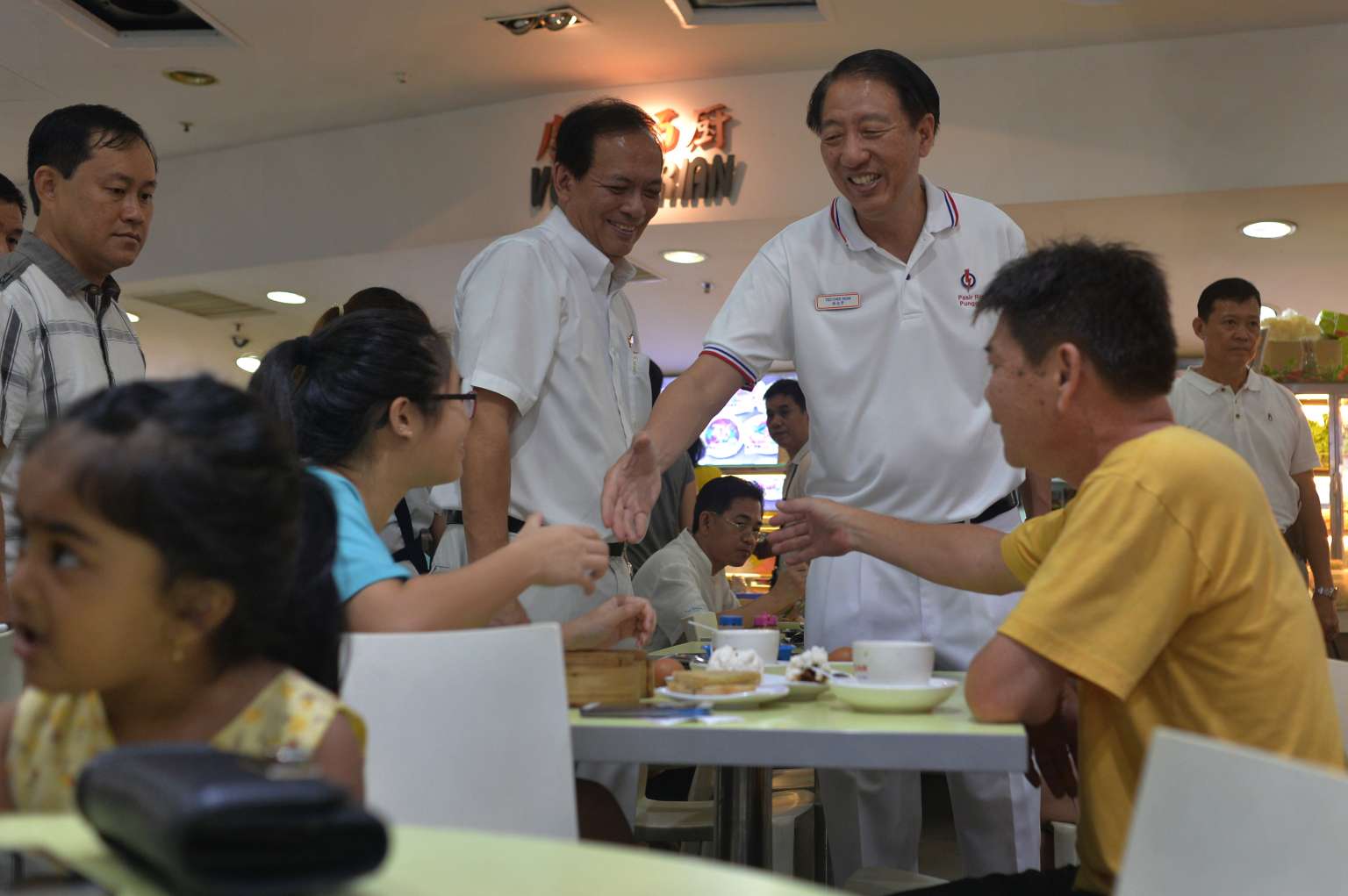 Deputy Prime Minister Teo Chee Hean (standing, right) and PAP Punggol East candidate Charles Chong greeting residents in Rivervale Plaza on Sept 6, 2015.