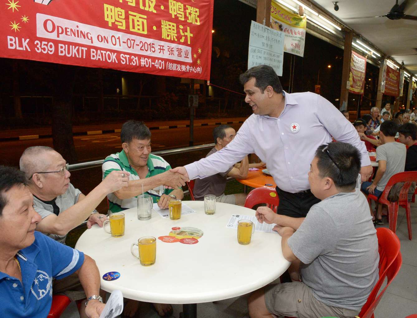 Singapore People's Party candidate Ravi Philemon (standing) greeting people during a walkabout in Bukit Batok on Sept 1, 2015.