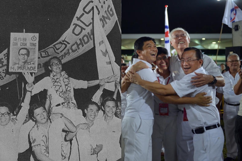 Emeritus Senior Minister Goh Chok Tong during his first general election in 1976 (left) and his last general election in 2015 with the Marine Parade GRC team, including Mr Tan Chuan-Jin, Mr Edwin Tong (hidden), Dr Fatimah Lateef and Mr Seah Kian Peng.