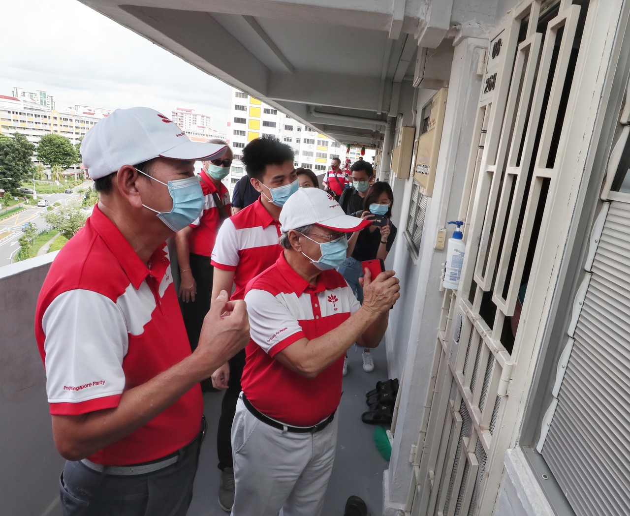 PSP candidates (from left) Francis Yuen, Choo Shaun Ming and Tan Cheng Bock visiting Block 9 Teck Whye Lane on July 3, 2020.