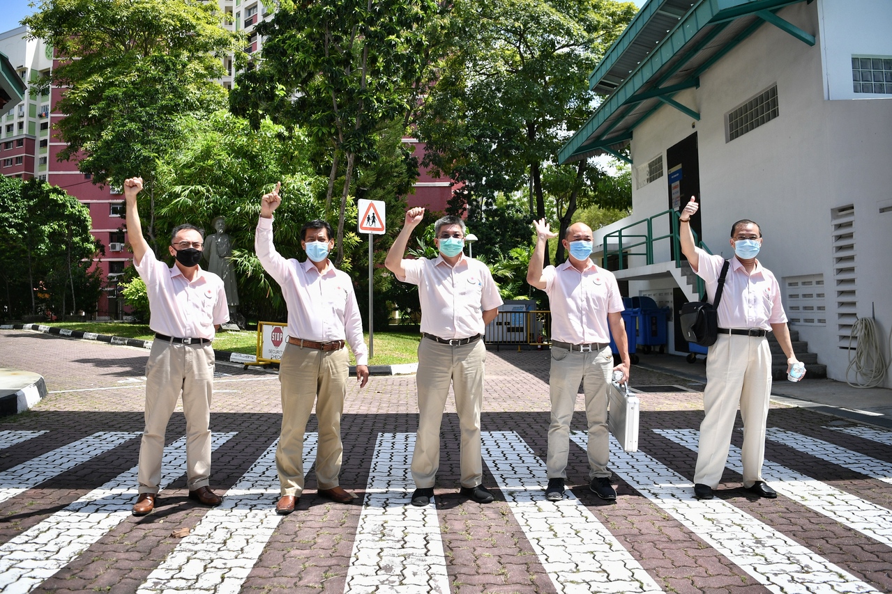NSP Tampines GRC team members (from left) Mr Choong Hon Heng, Mr Mohd Ridzwan Mohammad, Mr Reno Fong Chin Leong, Mr Eugene Yeo, and Mr Vincent Ng Kian Guan.