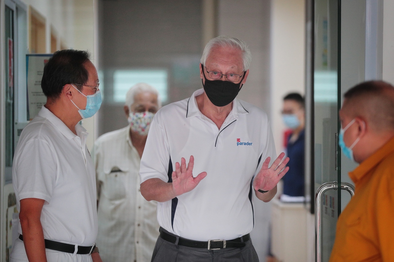 Emeritus Senior Minister Goh Chok Tong joins the PAP's Marine Parade GRC candidate Tan See Leng (left) on a walkabout in Marine Parade on July 4, 2020.